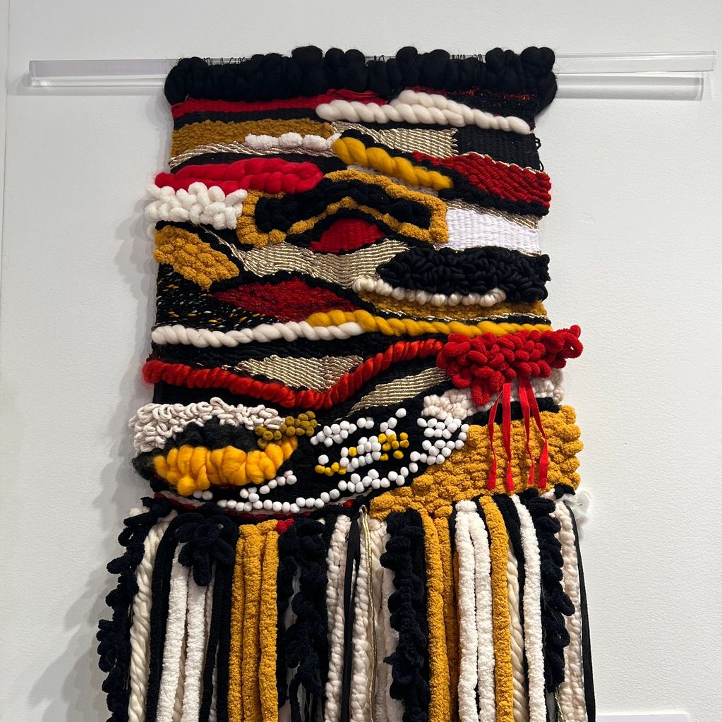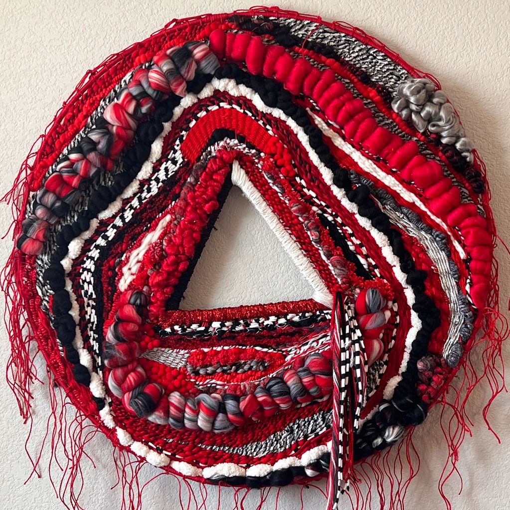 Known as one of the strongest geometric shapes, the triangle is revered in religion and in various practices around the world. The striking colors of this piece are rhythmic and alive! What starts as a defined structure, quickly becomes an amorphous shape with bold patterns.