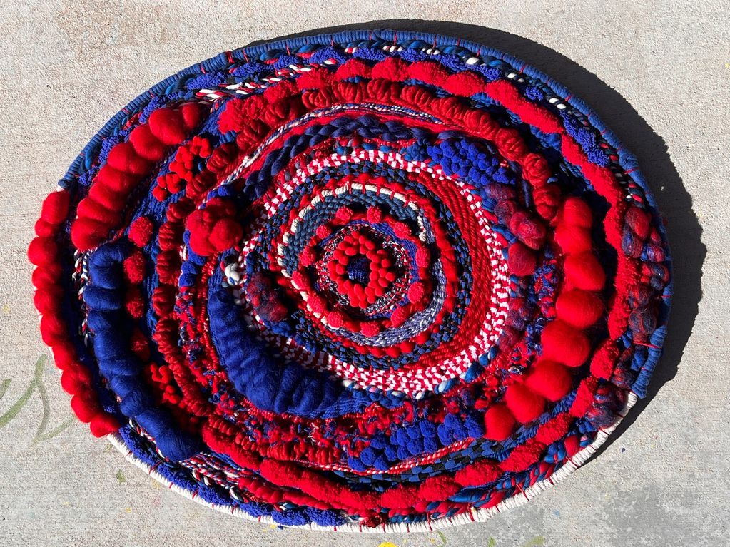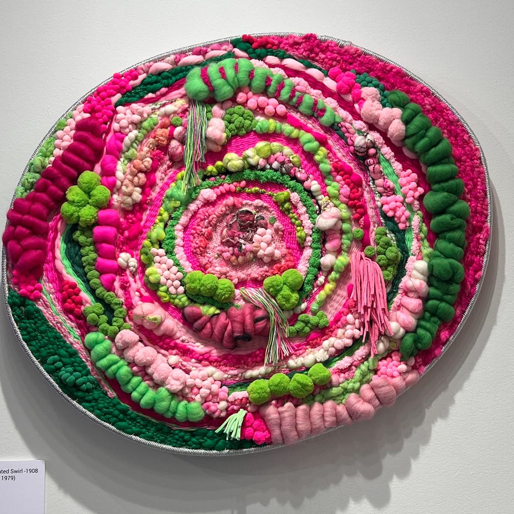 Taken from my fascination of the heavens, you will enjoy this whimsical creation. Through this piece we are returning home to a planet of pink and green hues.The view is 3 dimensional and characteristic of coming in for a landing. The strategic placement of fibers has created a swirling action that easily captures the attention of onlookers. This tapestry is part of the 20